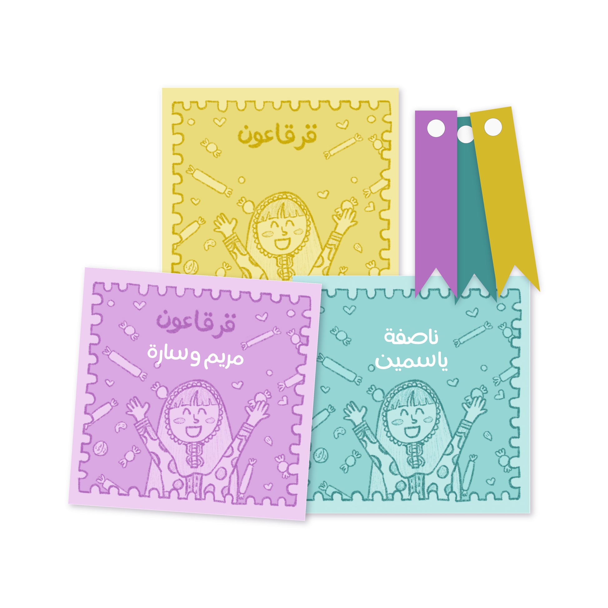 اختاري الصفحة التي تناسبك، توجد خانة مخفية للكتابة في كل بطاقة لكتابة اسم الطفل -