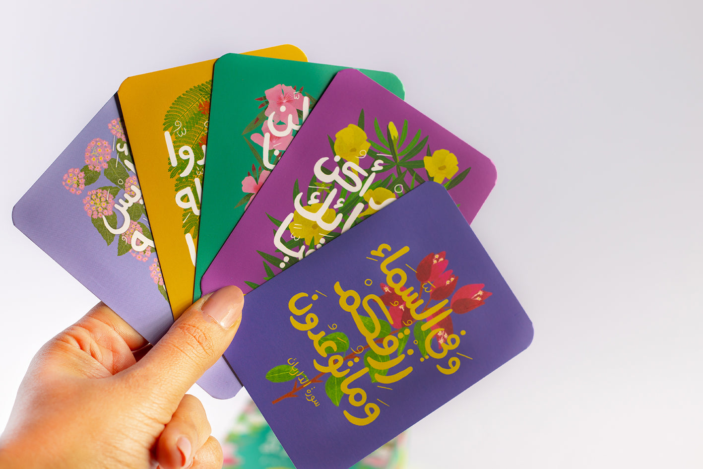 Inspired by the beauty of the colorful local flowers, comes this elegant box that contains 30 illustrated cards with 30 different verses from The Holy Qur'an.