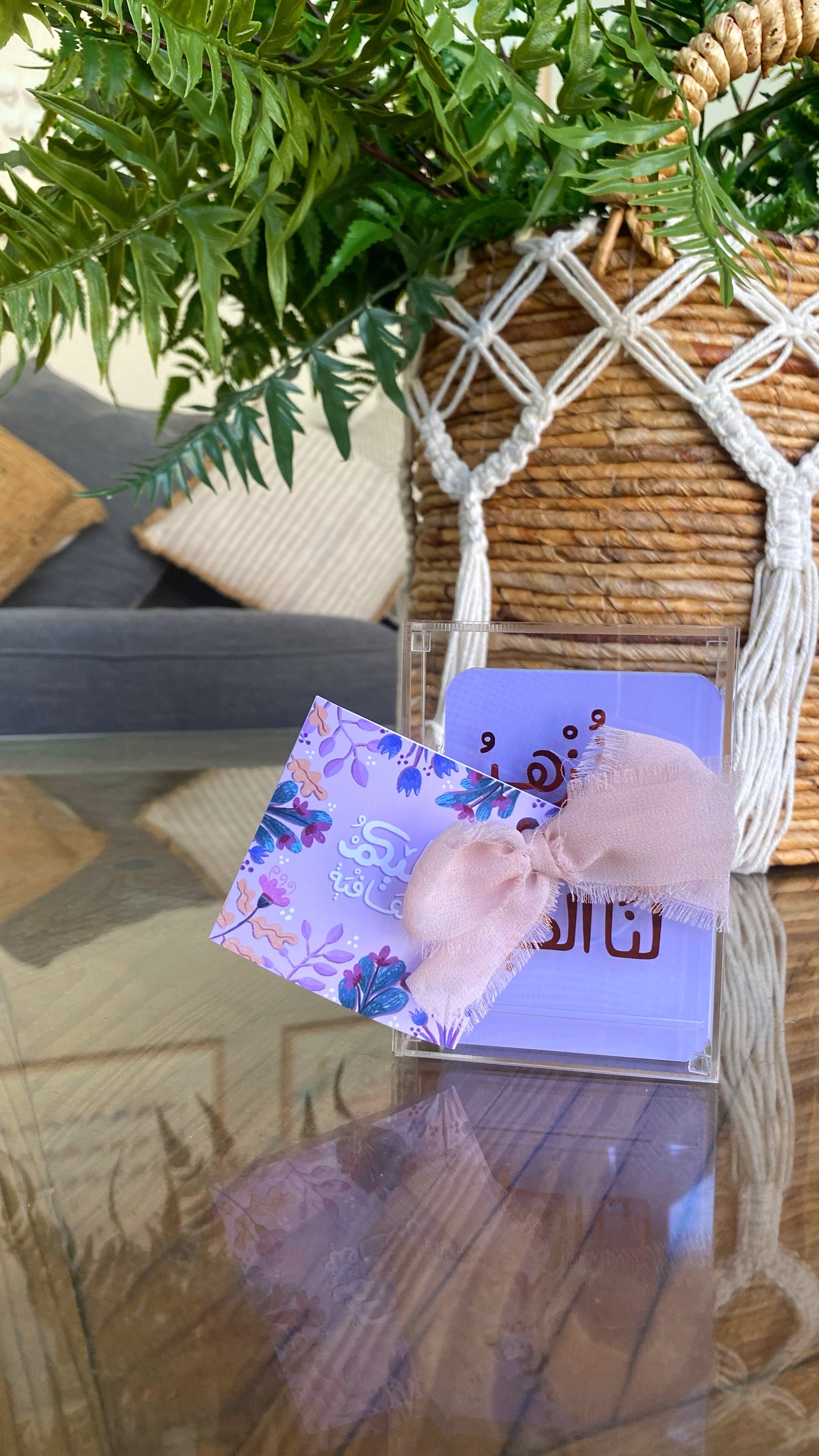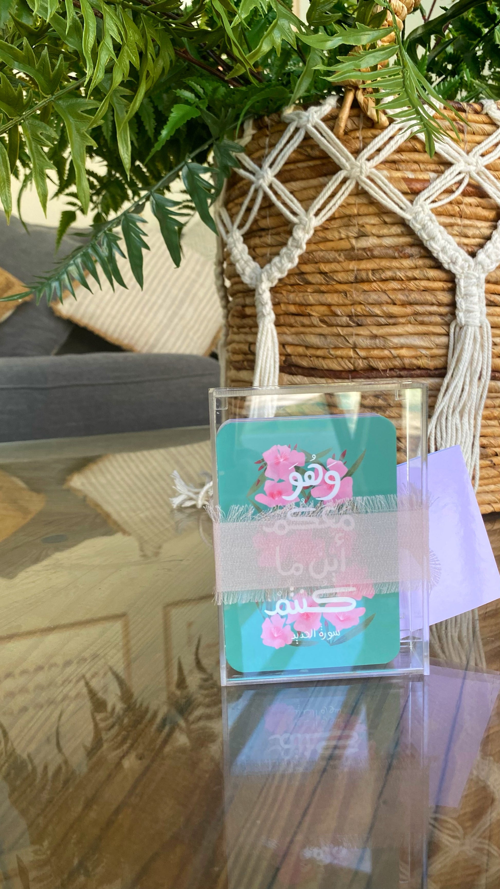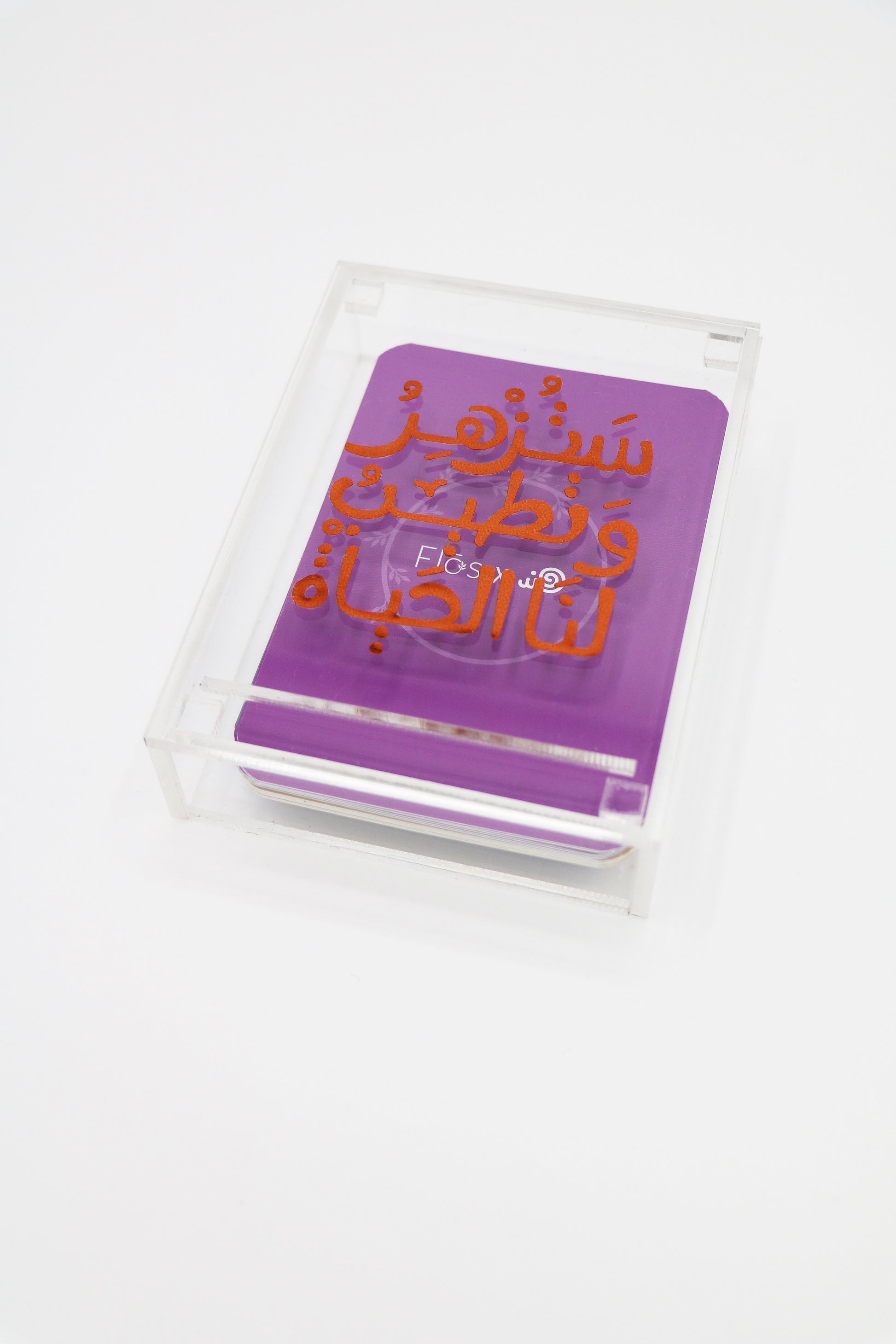 صندوق من الاكريليك الشفاف يتوسطه ملصق لامع "ستزهر وتطيب لنا الحياة"، يحتوي على 30 بطاقة ملونة مستوحاة من الورود المحلية الجميلة، في كل بطاقة آية قرآنية.