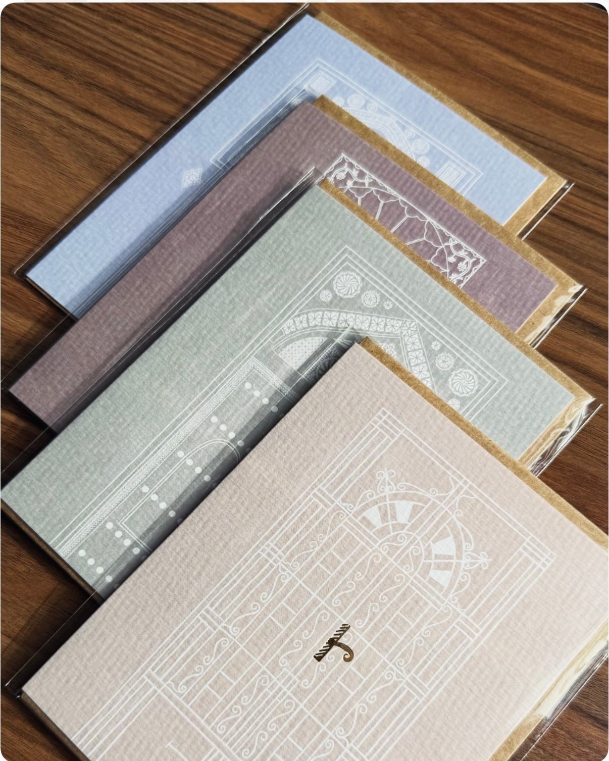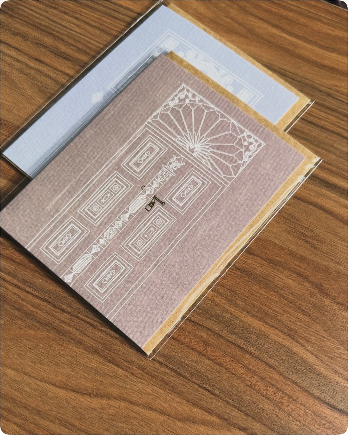 أربع بطاقات تهنئة أنيقة مستوحاة من الأبواب التقليدية في البحرين، مع إضافة لمسة ذهبية على مقبض الباب تُضفي رونقاً. مثالية لأي مناسبة، تُباع هذه البطاقات بشكل منفصل وتأتي مع ظرف بني سادة كلاسيكي.