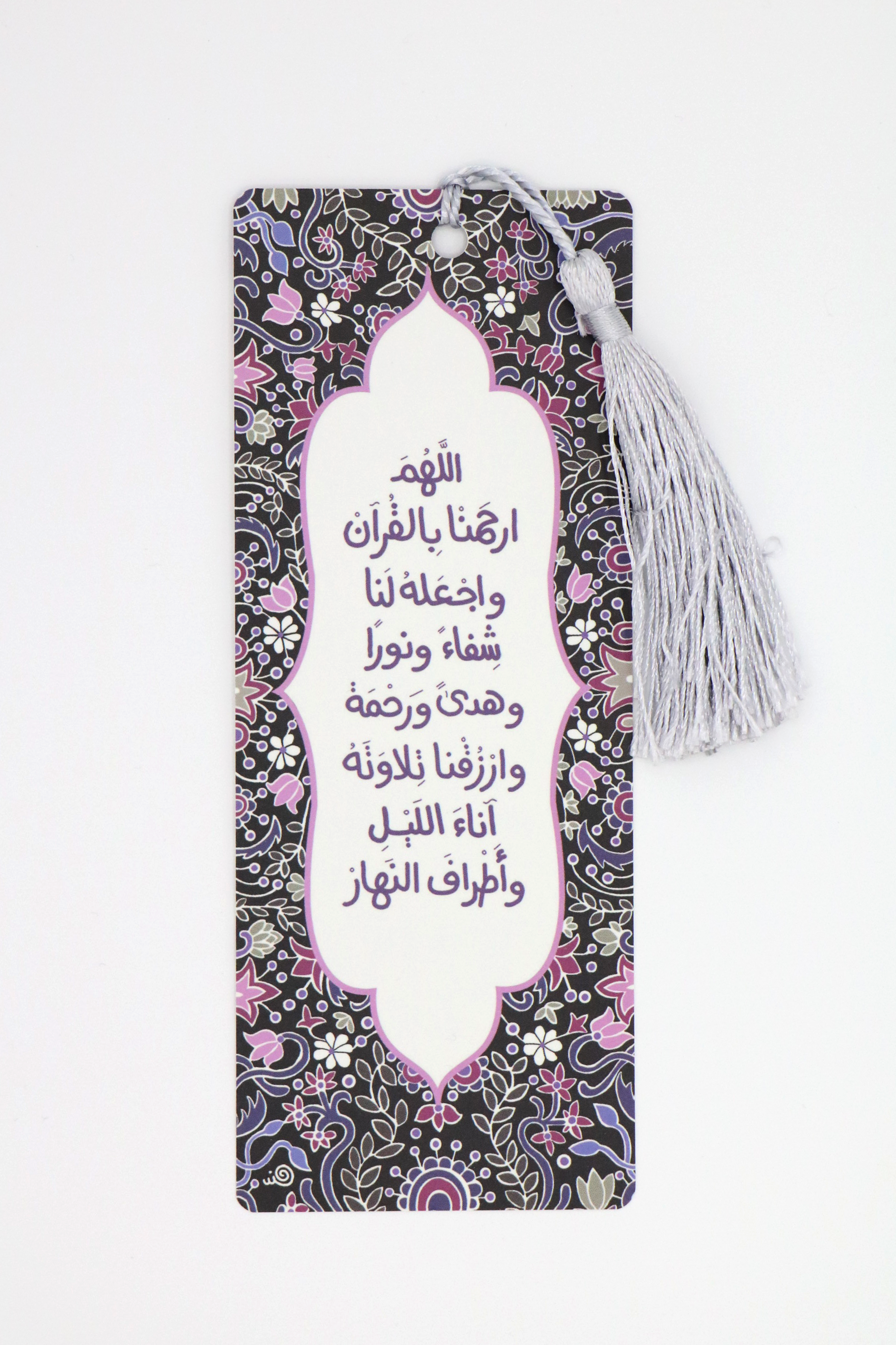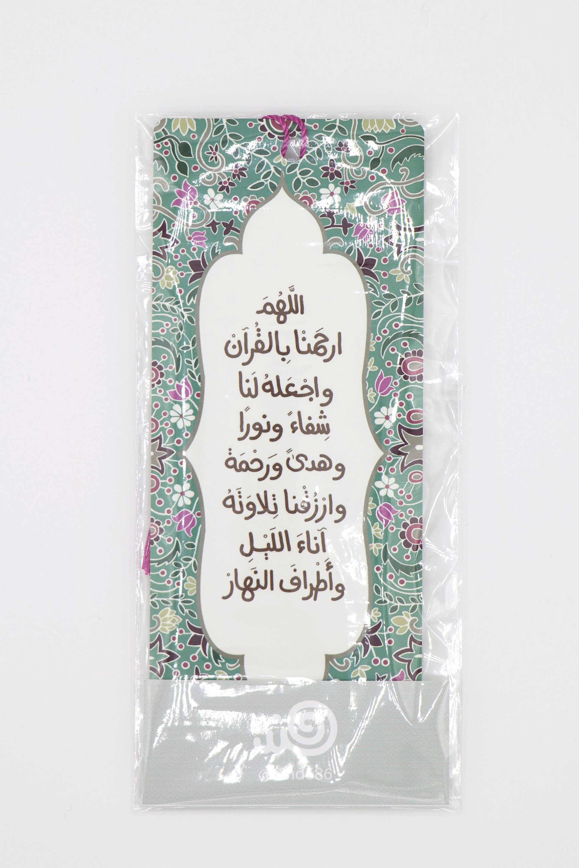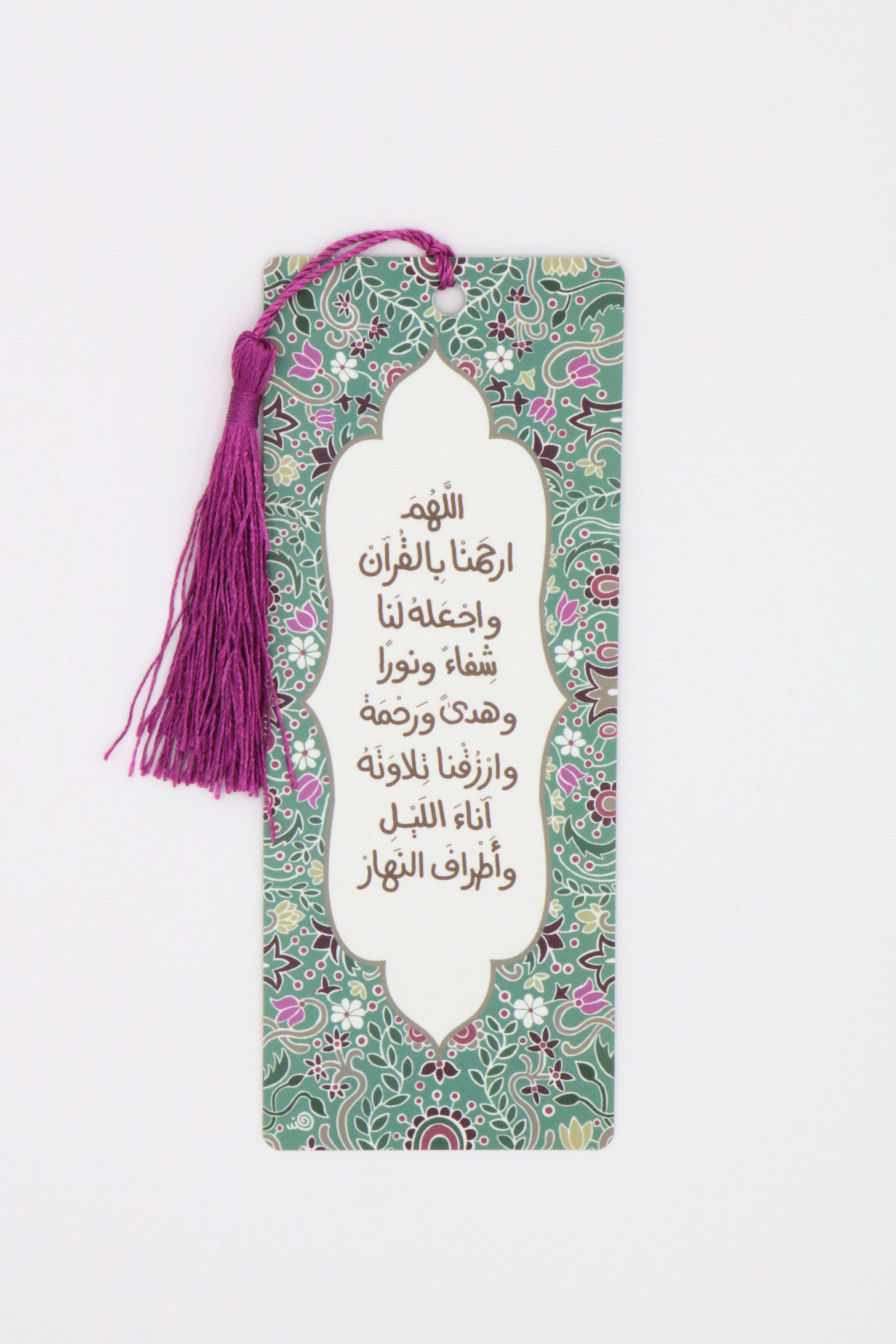 On the front side, the bookmark quotes a prayer, and on the backside, it contains a table to encourage a “Khatma”; completing reading the holy Qura’an in one month.